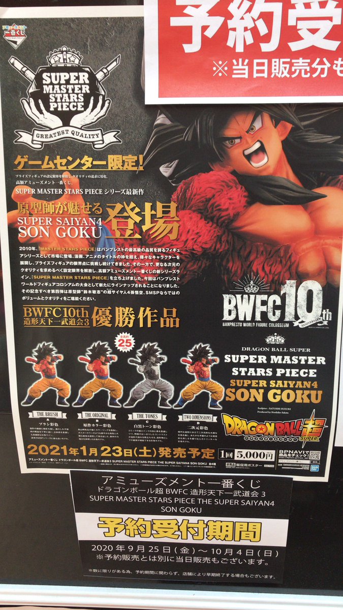 『アミューズメント一番くじ ドラゴンボール超 BWFC 造形天下一武道会3 SUPER MASTER STARS PIECE THE SUPER SAIYAN4 SON GOKU』の事前予約が本日から10/4までの期間限定で受付中です! 前回は発売日当日に完売してもなお、多くのお問い合わせがありました。絶対に欲しい方は予約をお勧めします!