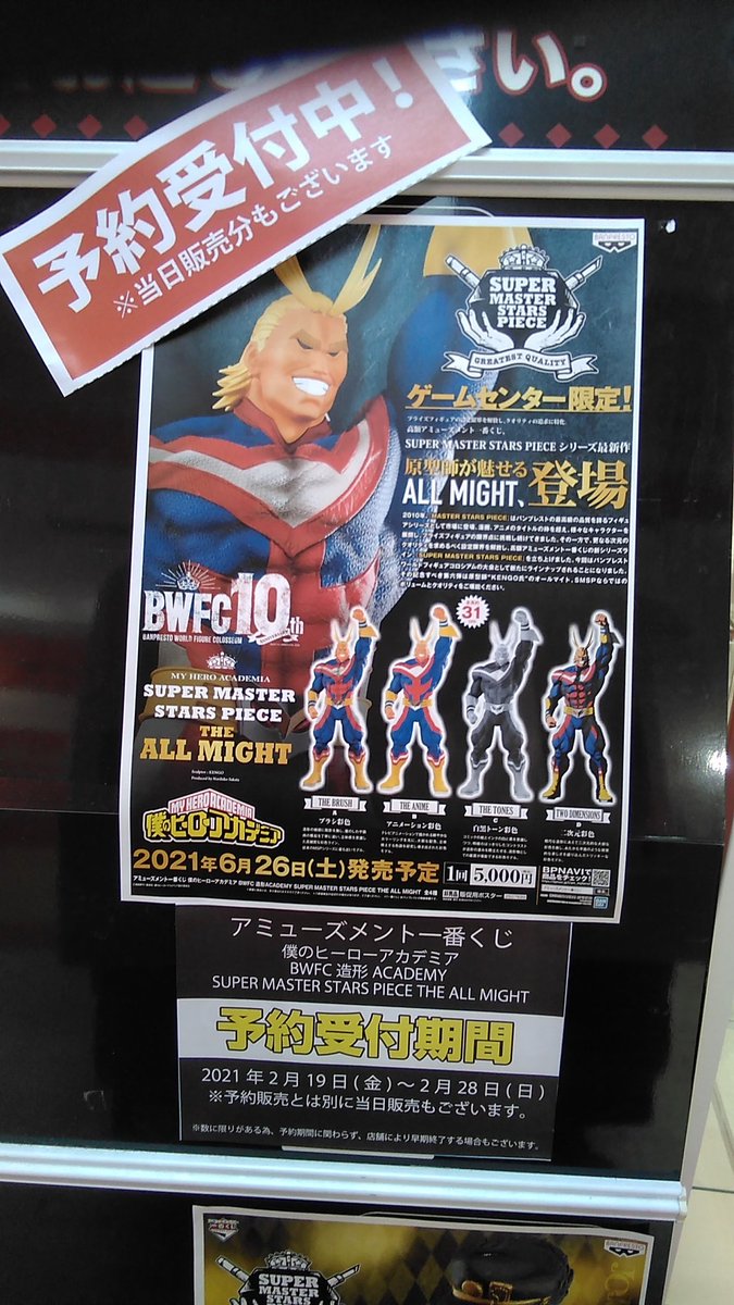 「アミューズメント一番くじ 僕のヒーローアカデミア BWFC 造形ACADEMY SUPER MASTER STARS PIECE THE ALL MIGHT」の予約申し込みを、本日から2月28日の期間限定で受付中です! アミューズメント一番くじの当日販売分はいつもすぐに完売してしまいますので、ご購入予定の方はご予約を!