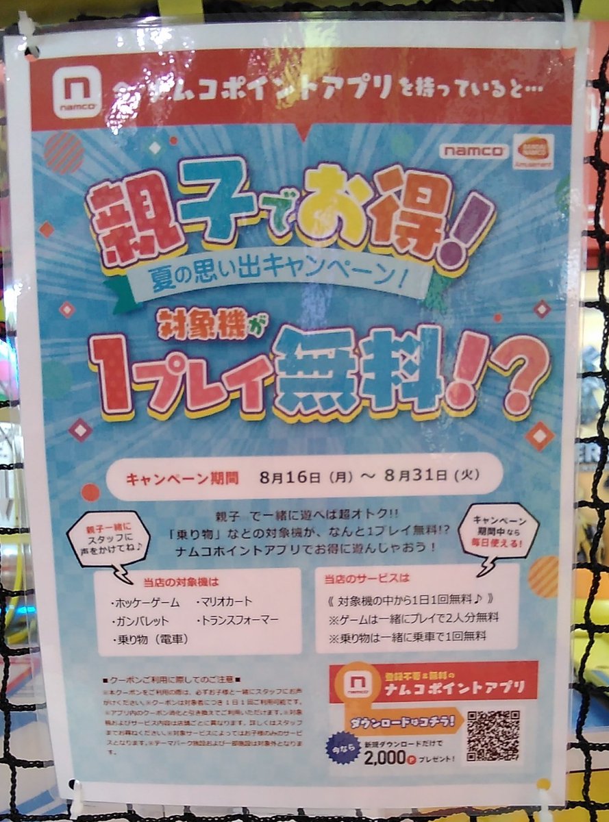 本日より8/31までの期間限定で、親子で一緒に遊べるゲーム機がナムコアプリのクーポンを使うと無料でプレイ出来ます。