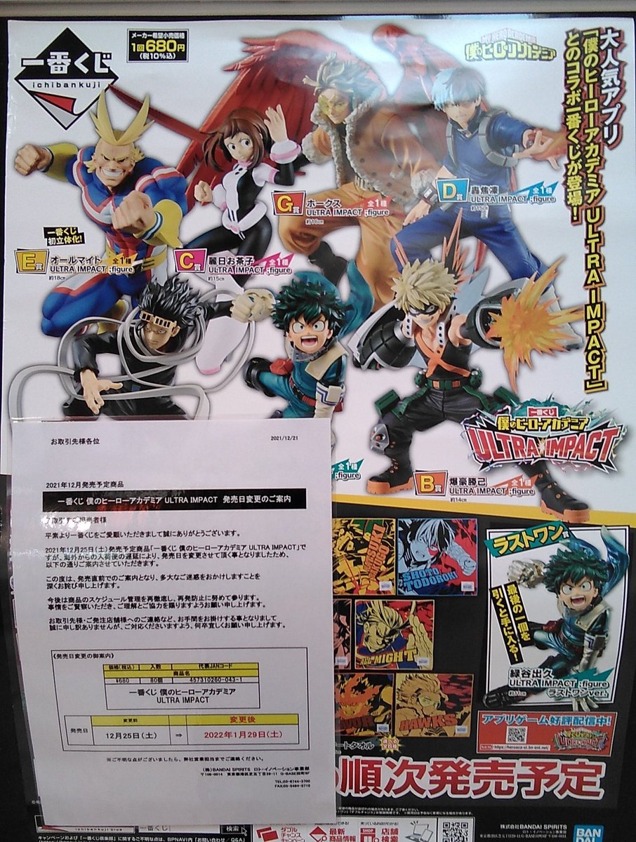 本日発売予定でした一番くじ 僕のヒーローアカデミア ULTRA IMPACT は1月29日(土)に延期になっております。 [ワンダーシティ札幌 プラボ札幌西町店【Twitter】]