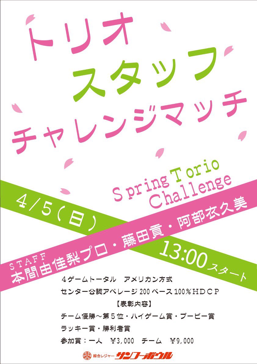 皆さんおはようございます☀️大会のご案内です😌4月5日13時より、トリオスタッフチャレンジマッチを開催致します!3人1組のチームで... [綜合レジャー サンコーボウル【Twitter】] | サンコーボウル