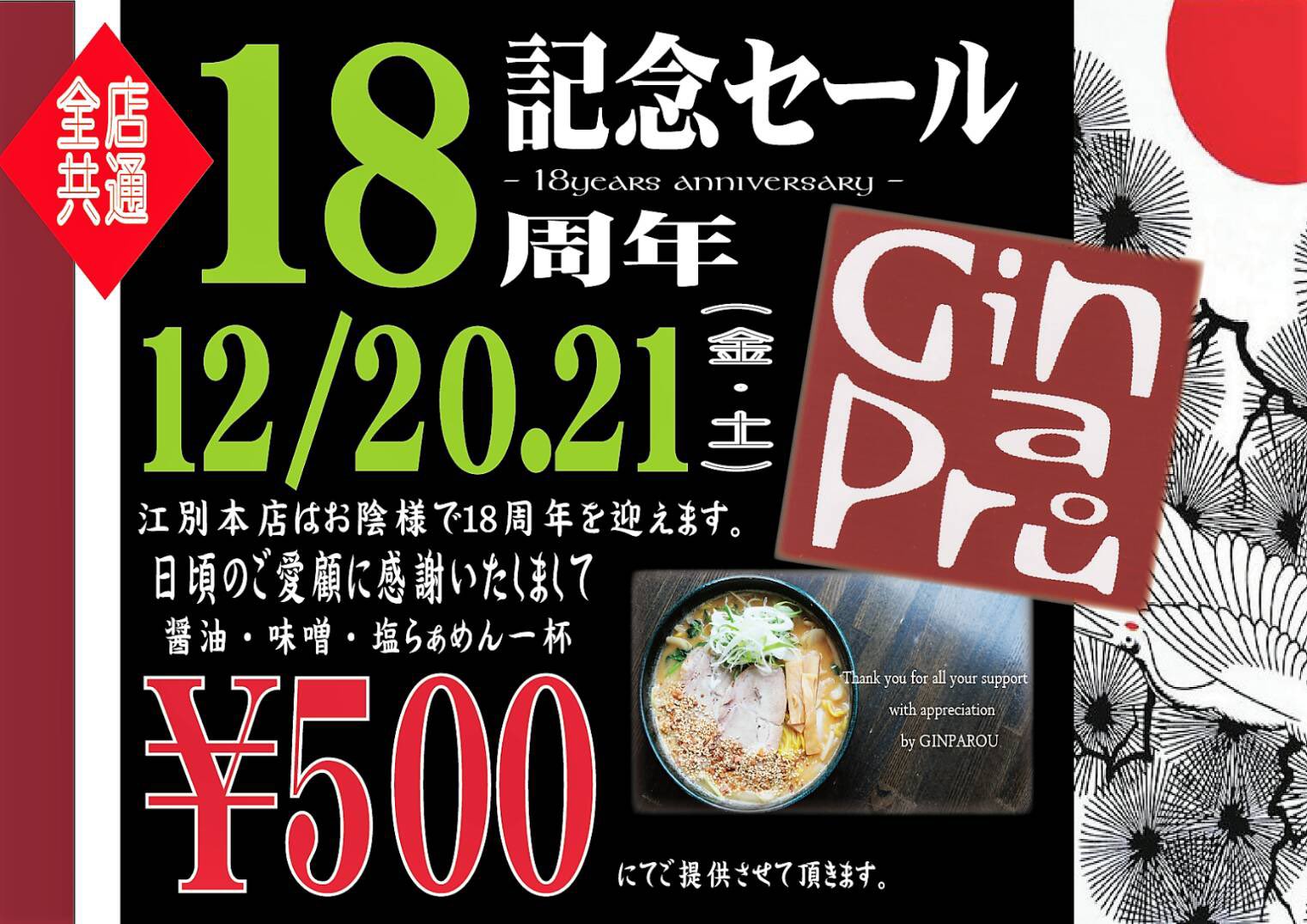 12月20日 21日の2日間銀波露全店舗で行います! こちらの画面提示でらぁめん(醤油 味噌 塩)が500円となります