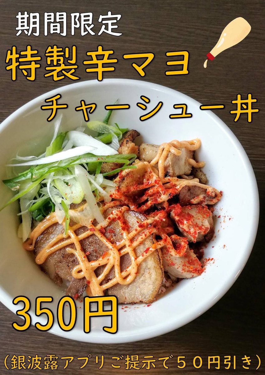 本日から『特製辛マヨチャーシュー丼 350円』を販売します❗️オリジナル特製辛子マヨネーズはガーリック風味で箸が止まらない😎チャー... [らぁめん銀波露 札幌手稲店【Twitter】] | 銀波露 札幌手稲店