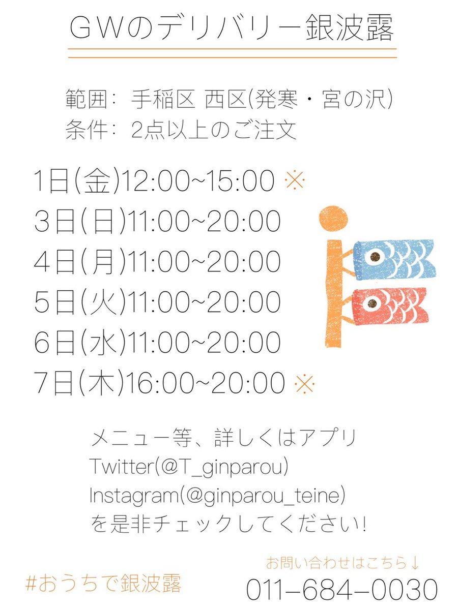 ゴールデンウィーク期間のデリバリーのお知らせです❗️すでに何件かご予約いただいております🙏当日予約も早めにいただけると優先し... [らぁめん銀波露 札幌手稲店【Twitter】]