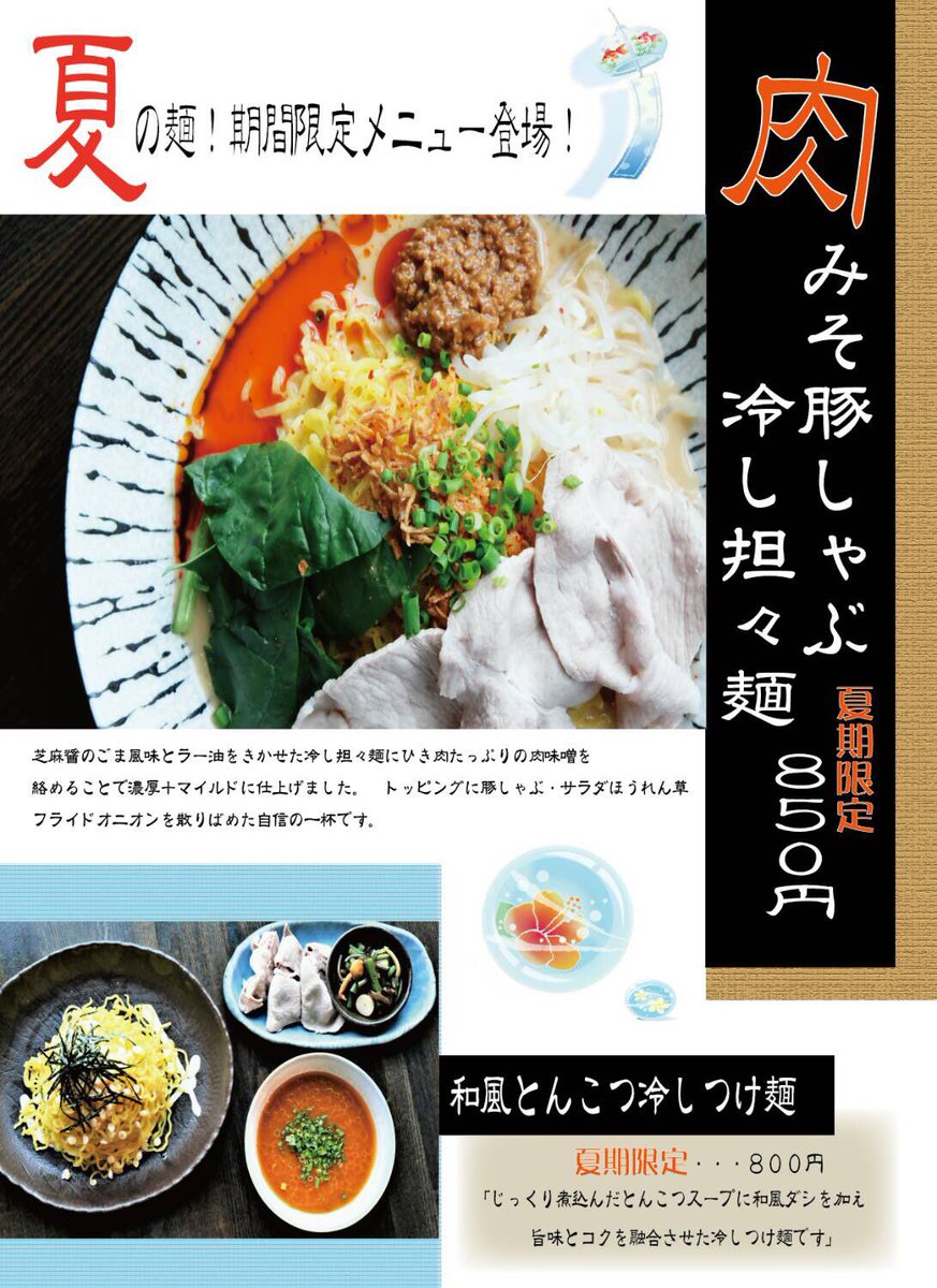 3連休2日目🔥🔥夏の限定麺がオススメです🙌🏻🙌🏻”肉みそ豚しゃぶ冷し担々麺""和風とんこつ冷しつけ麺"両方とも麺を1.5玉使用す... [らぁめん銀波露 札幌手稲店【Twitter】]