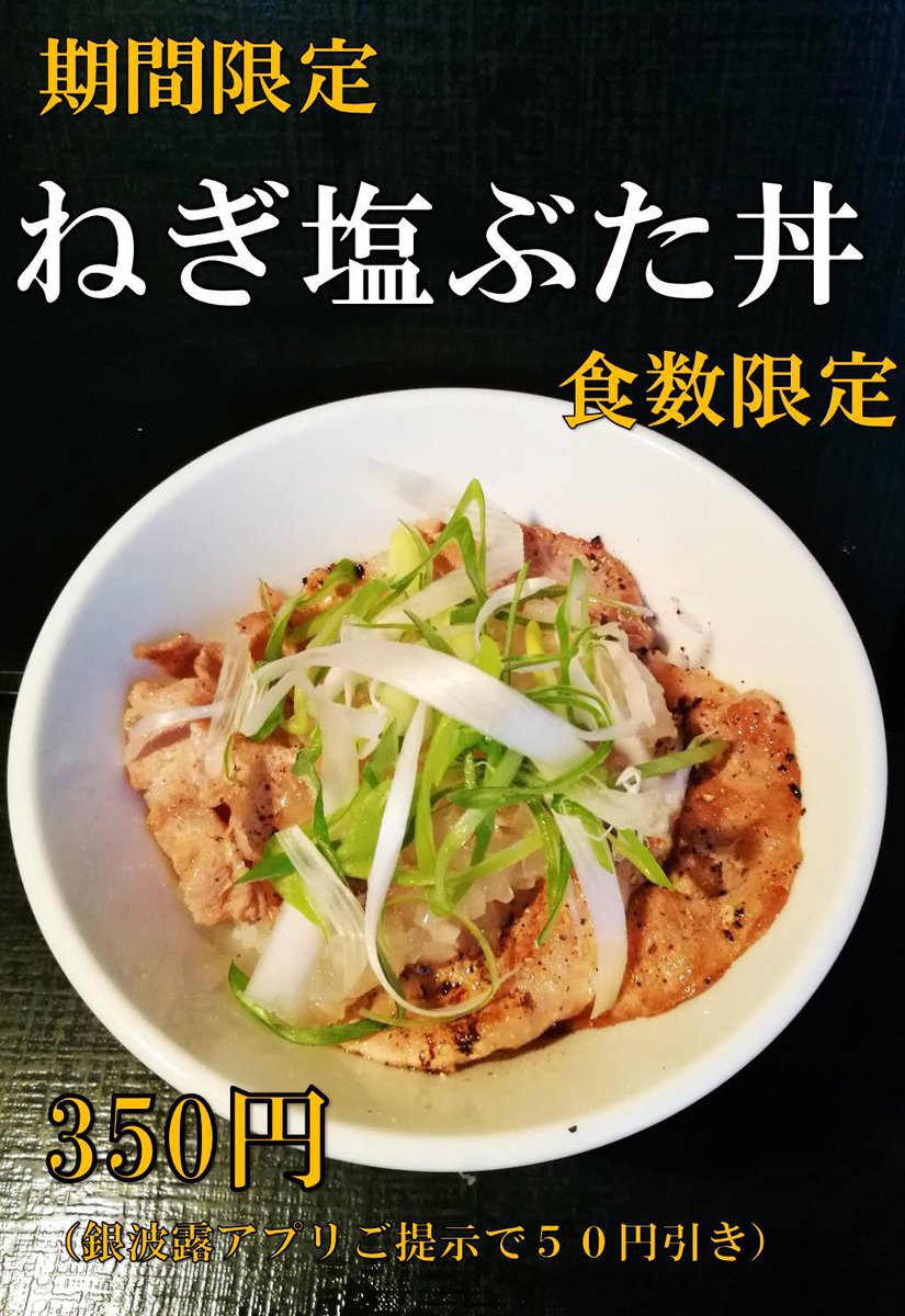 "ねぎ塩ぶた丼"本日より期間限定で販売します🔥特製ねぎ塩ダレと焼いた豚肉の相性抜群!!シャキシャキの軟白ねぎを使用しておりま... [らぁめん銀波露 札幌手稲店【Twitter】] | 銀波露 札幌手稲店