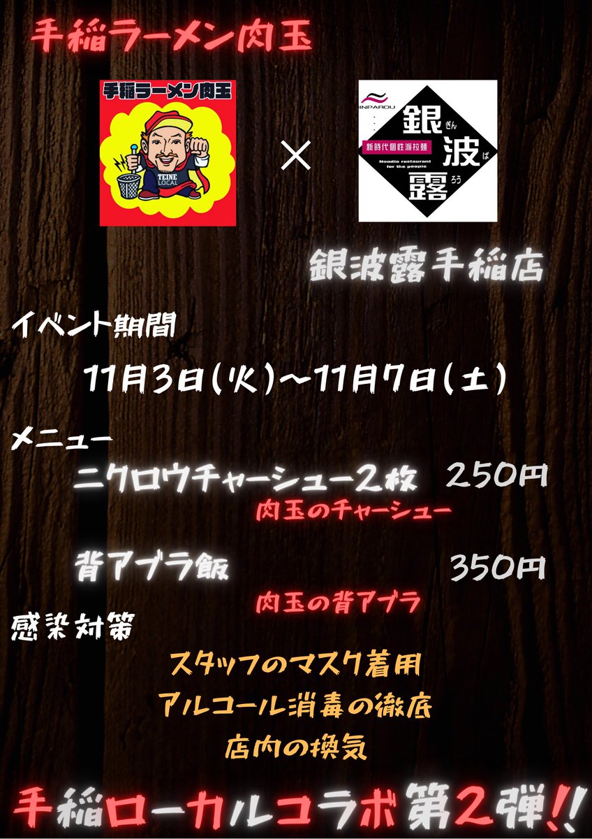 本日、手稲ラーメン肉玉様とのコラボ最終日です🥺 [らぁめん銀波露 札幌手稲店【Twitter】]