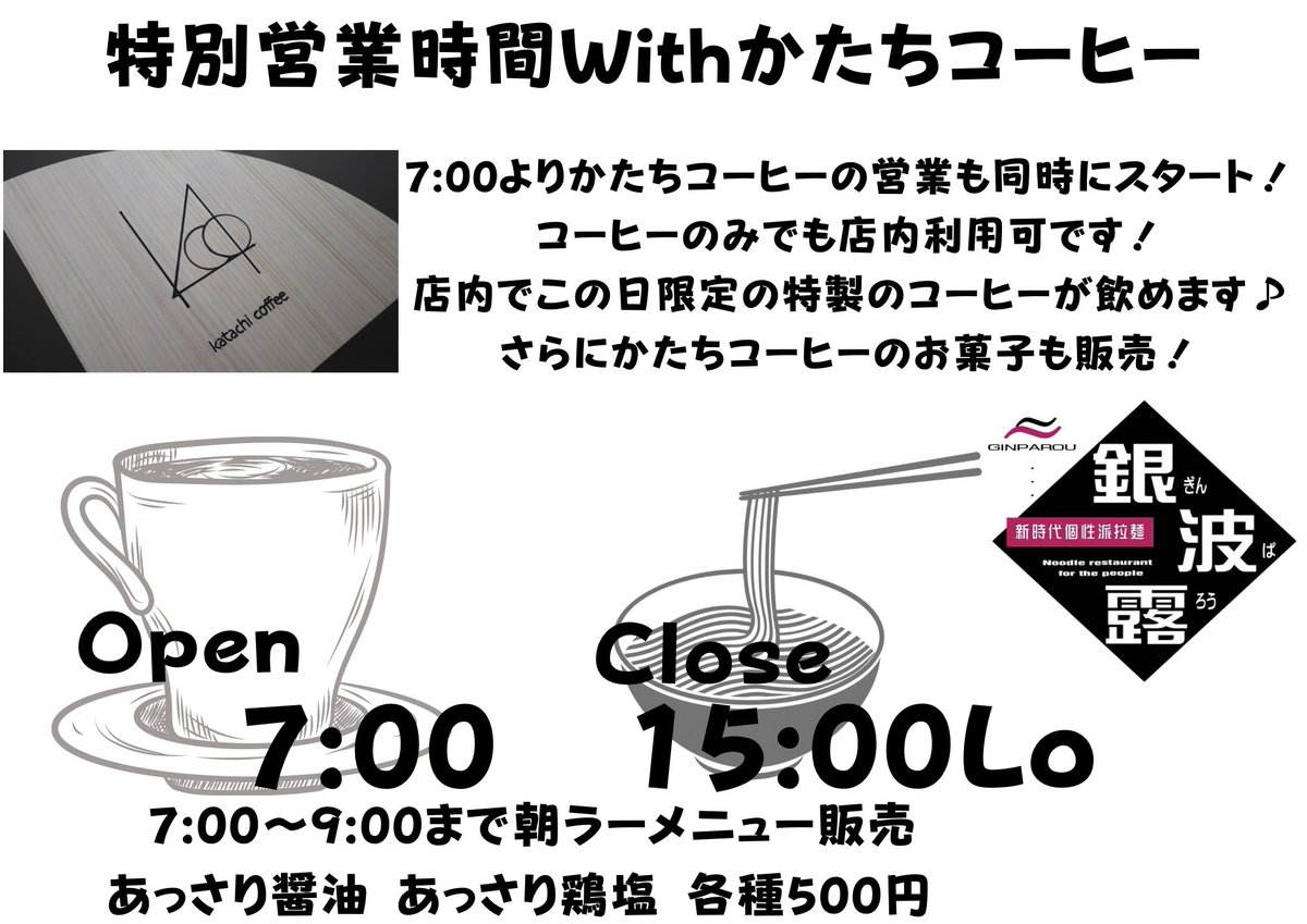 12月20日(月)は特別営業日となります☕️🍜間借りで営業している【かたちコーヒー】のスタッフさんと一緒に1日営業します!銀波露手稲... [らぁめん銀波露 札幌手稲店【Twitter】]