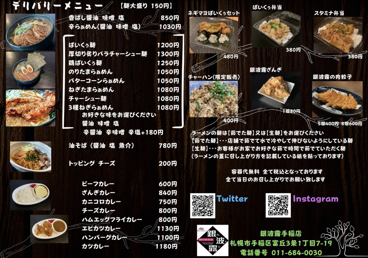 デリバリー営業のお知らせ🔥8月29日(月)12:00〜18:00手稲区全域 西区(宮の沢 発寒)送料無料!容器代無料!お得なデリバリー営業... [らぁめん銀波露 札幌手稲店【Twitter】] | 銀波露 札幌手稲店