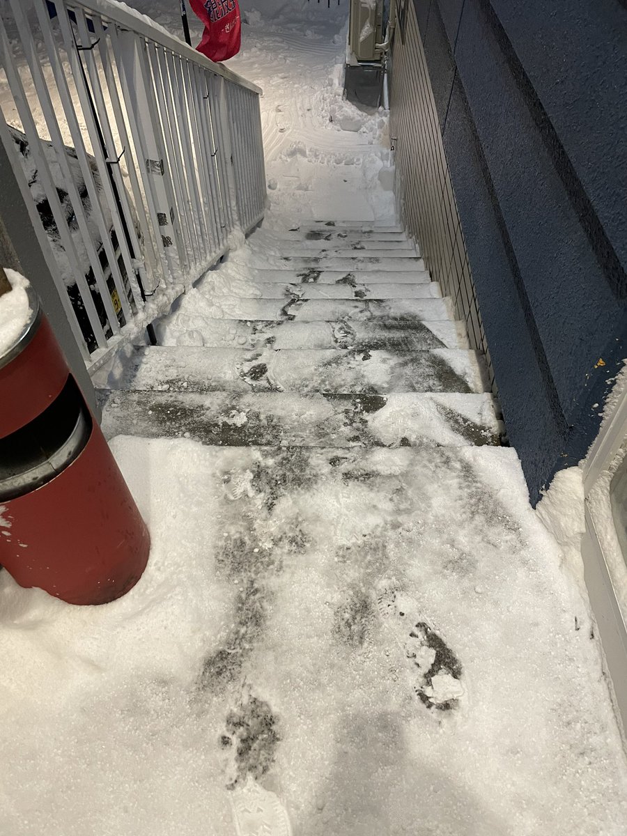 上から階段出す→下から戻ってきたらうっすら積もってる🫠笑慰めのご来店お願いします🤣🙏 [らぁめん銀波露 札幌手稲店【Twitter】]