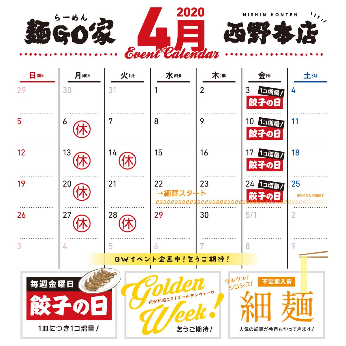 / 4月カレンダー完成 📅\今日から新年度がスタート🌸今月も麺GO家をよろしくお願いいたします♪==今月のイベント予定==... [らーめん・麺GO家(めんごや) 西野店【Twitter】] | らーめん 麺GO家西野本店