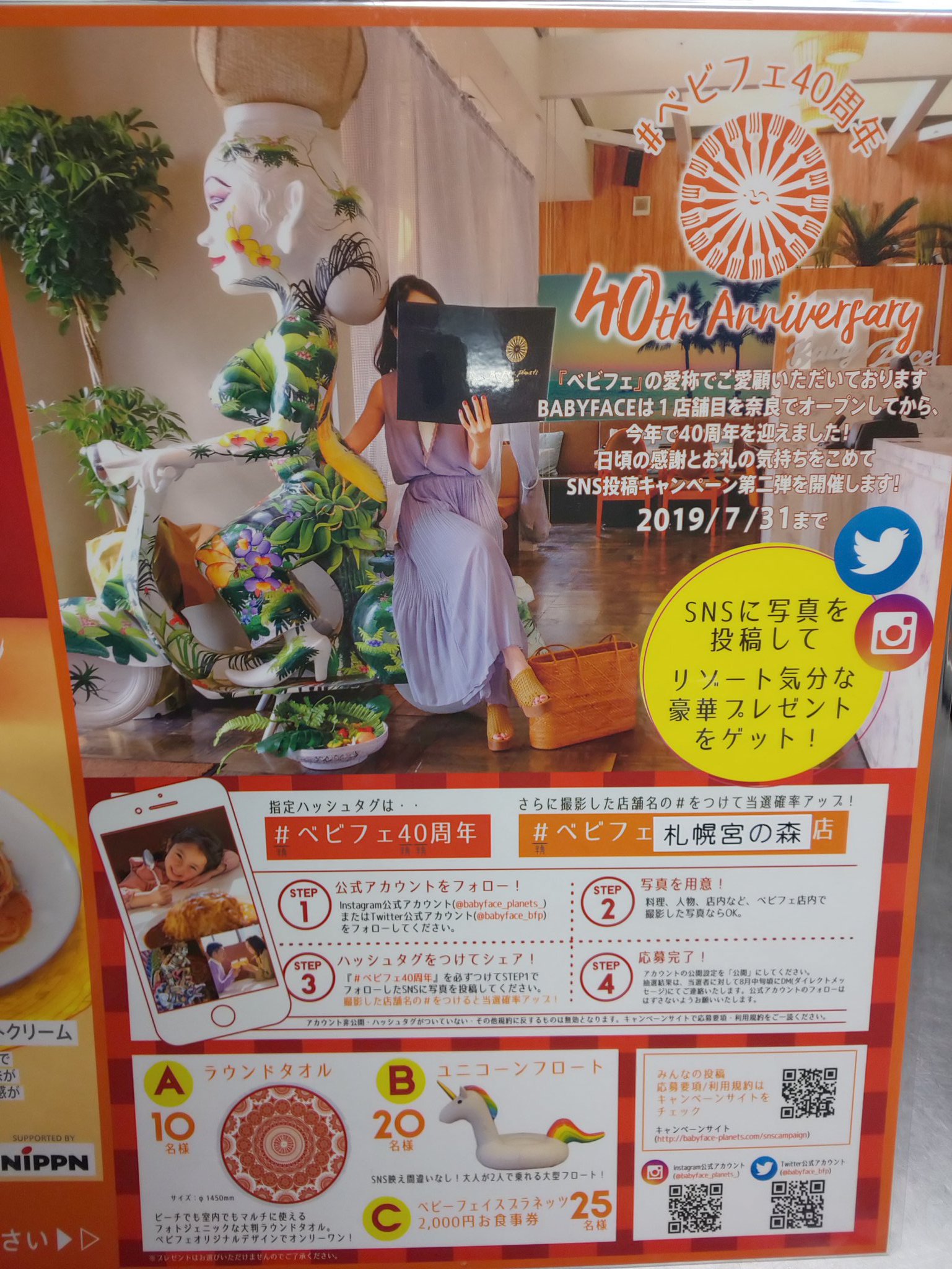 おはよーございます! ベビフェ40周年記念キャンペーン第二弾はじまりましたよー。 ハッシュタグの後に 札幌宮の森店を付けると当選しやすいかも!!!#ベビフェ40周年記念#ベビフェ札幌宮の森店 更に夏の新メニューベヒトマも頼んで#ベビトマ もつけると さらにさらに当選確率アッープ! pic.twitter.com/qIlcfkoveZ