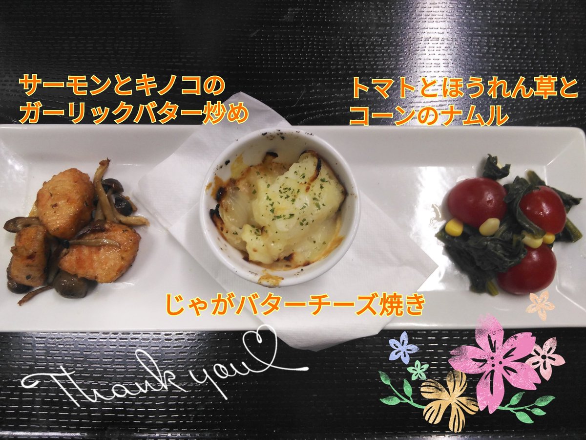 こんばんは!ほんのリッチランチ前菜のご紹介です。🐳トマトとほうれん草とコーンのナムル🐳じゃがバターチーズ焼き🐳サーモンとキノ... [ベビーフェイスプラネッツ 札幌宮の森店【Twitter】]