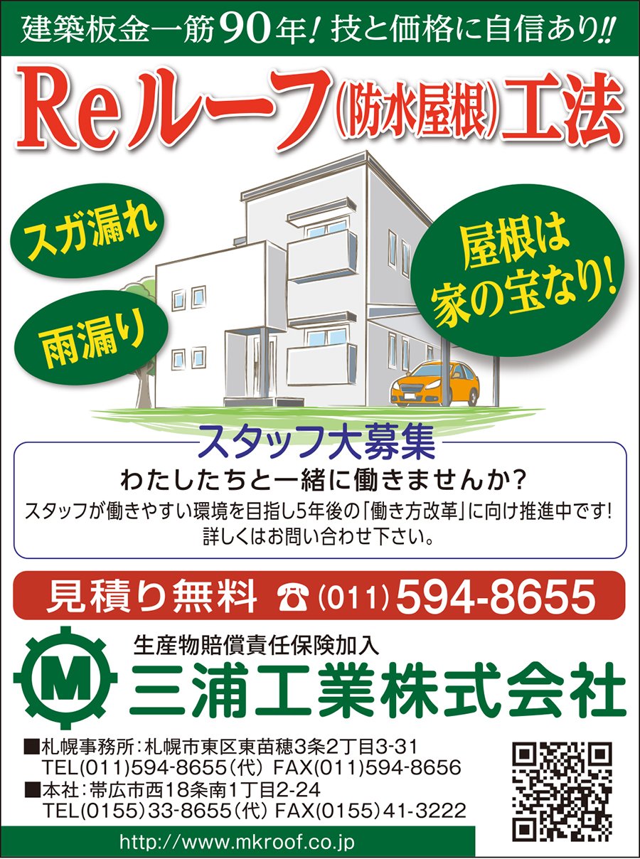 Re ルーフ(防水屋根)工法 屋根は家の宝なり! ●スガ漏れ ●雨漏り 「住まいのリフォーム」もおまかせください。 ●バリアフリー工事 ●断熱改修工事 ●窓交換 ●外壁改修工事 ●水廻り工事 住環境を考え、ご家庭が元気になるリフォームを三浦工業が自信をもってお手伝いします。 ★見積無料 (2019年6月13日現在の情報です)