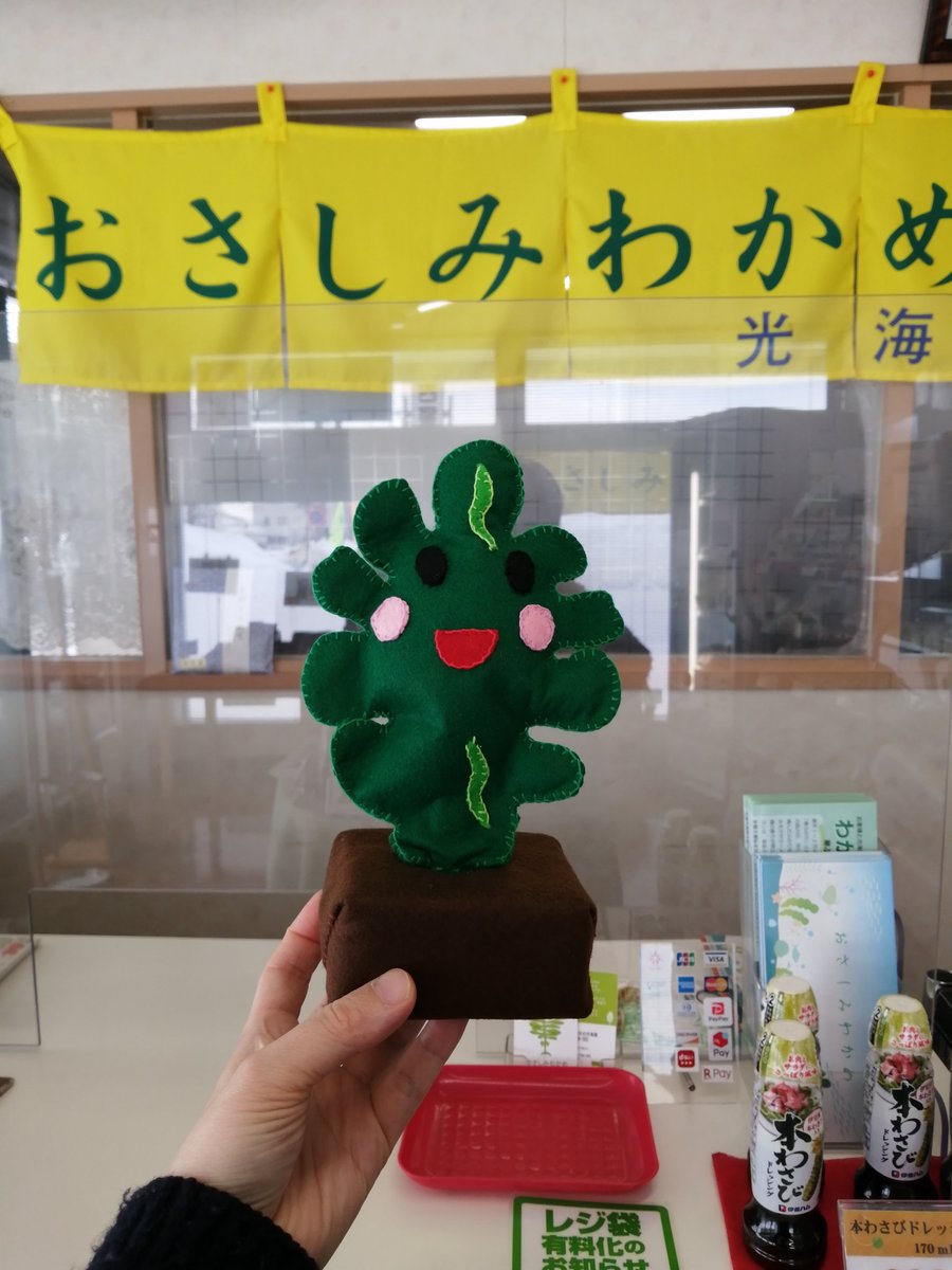 工場長の奥さんが作って送ってくれたわかめちゃん。愛を感じます。#わかめちゃん #光海藻ゆるキャラ [光海藻【Twitter】] | おさしみわかめの光海藻