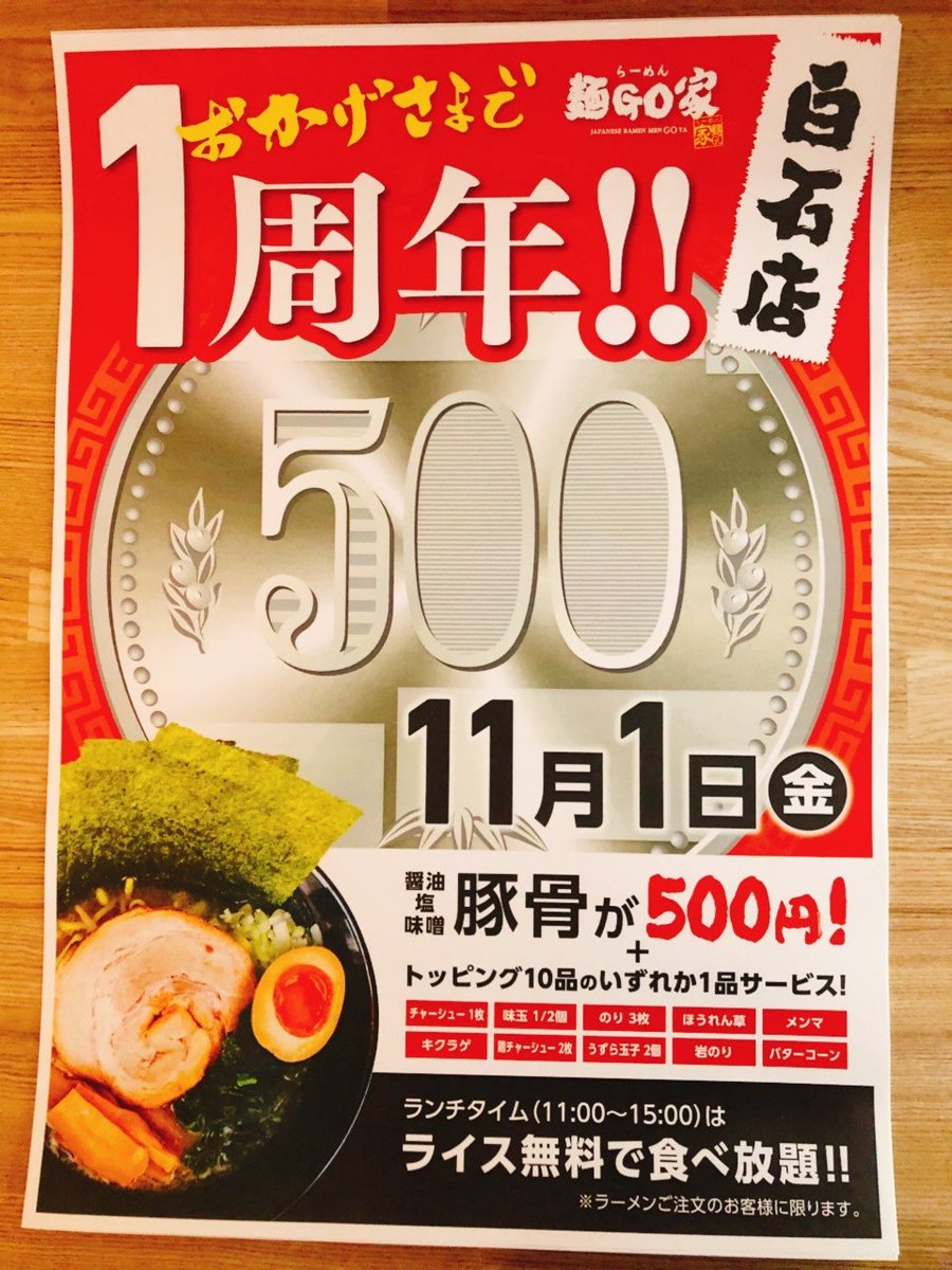 『500円イベントのお知らせ』お陰様を持ちまして、11/1 でOpenして、1年となりました。感謝を込めて1日限りでは有りますが、¥500イ... [らーめん・麺GO家(めんごや) 白石店【Twitter】]