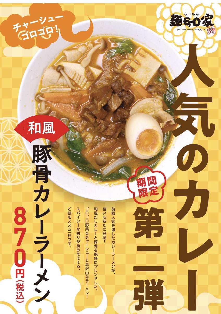 『新限定らーめん、デリバリー』のお知らせ、本日より限定らーめんが変更になります(豚骨和風カレーらーめん)スープカレー的な感じに... [らーめん・麺GO家(めんごや) 白石店【Twitter】] | らーめん 麺GO家(めんごや)白石店
