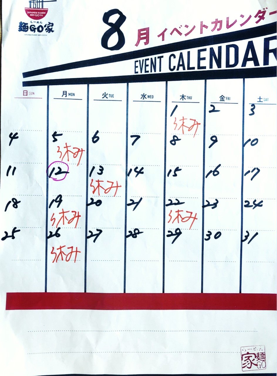 (8月の営業日程) おはようございます。 麺GO家 白石店です。 来月の予定になります。 今後とも皆様の御来店お待ちして居りますm(_ _)m#麺GO家#mengoya pic.twitter.com/L0KixWF6h9
