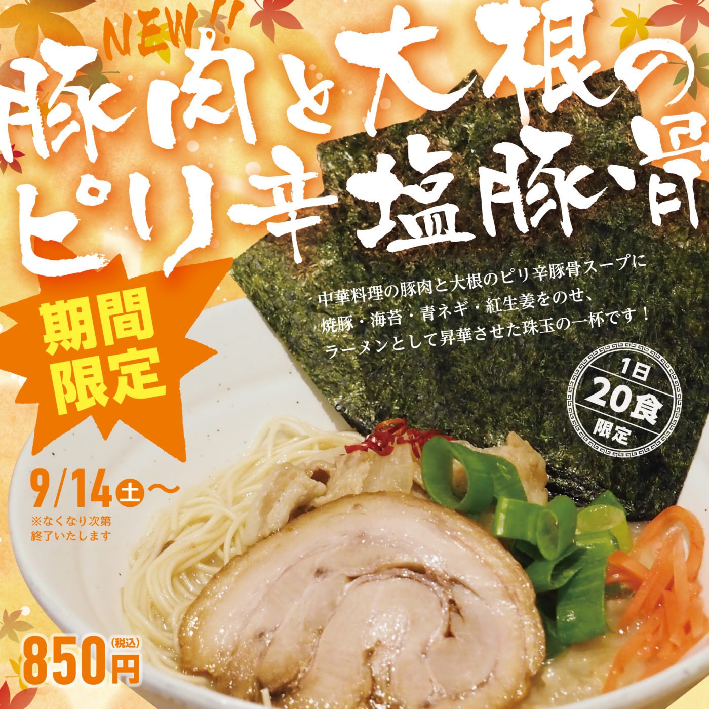 昨日の500円企画、多数のご来店誠にありがとうございました! そして本日9/14より期間限定メニュー「豚肉と大根のピリ辛塩豚骨」をスタート!中華料理の豚肉と大根のピリ辛スープに、焼豚・海苔・青ネギ・紅生姜をのせラーメンとして昇華させた珠玉の一杯! 白石店限定です。ぜひお召し上がり下さい! pic.twitter.com/v4cUZRidna