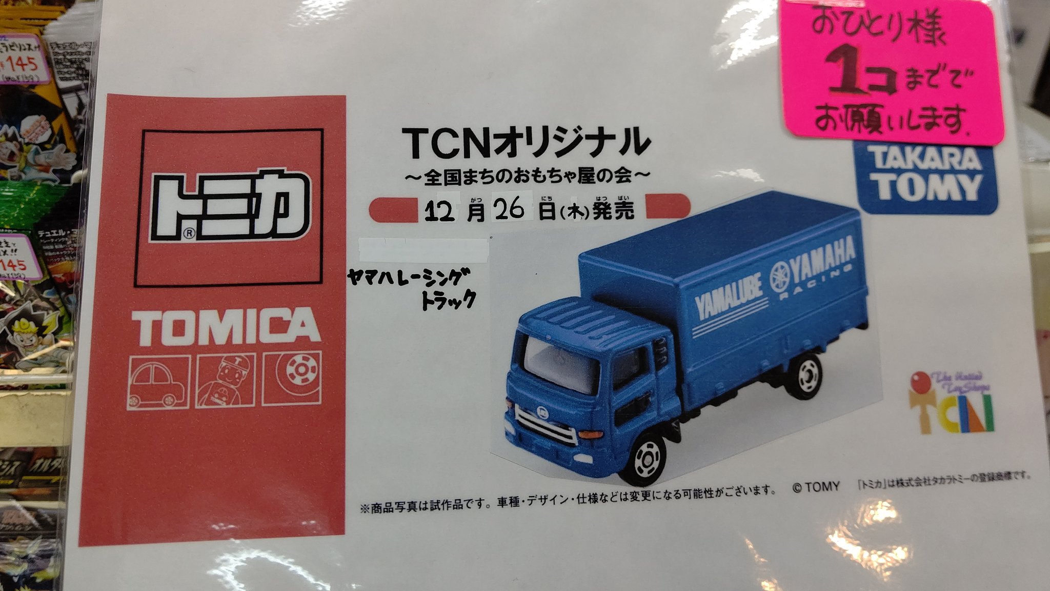 TCNオリジナル トミカ 今回は、 ヤマハ レーシングトラック! 札幌では、買えるのは おもちゃの平野だけですよ! 店頭でのみ、 予約受付中です! 発売は、令和元年12月26日 700円+税です よろしくお願いします!#トミカ#ヤマハ#TCN pic.twitter.com/0bVz7KBBip
