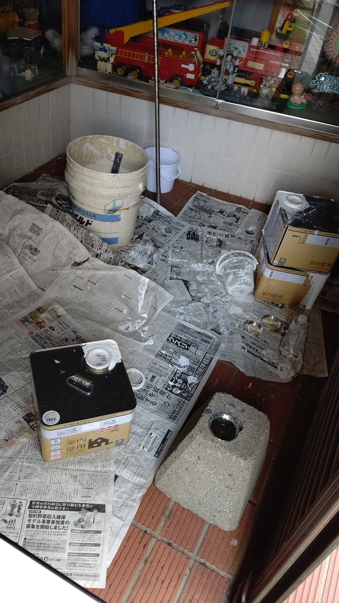 シャッターのすき間から覗くと中はこんな感じで・・・前を通った親子連れが「今は塗装屋さんしかいないからおもちゃ買えないよ」って言... [おもちゃの平野【Twitter】] | おもちゃの平野
