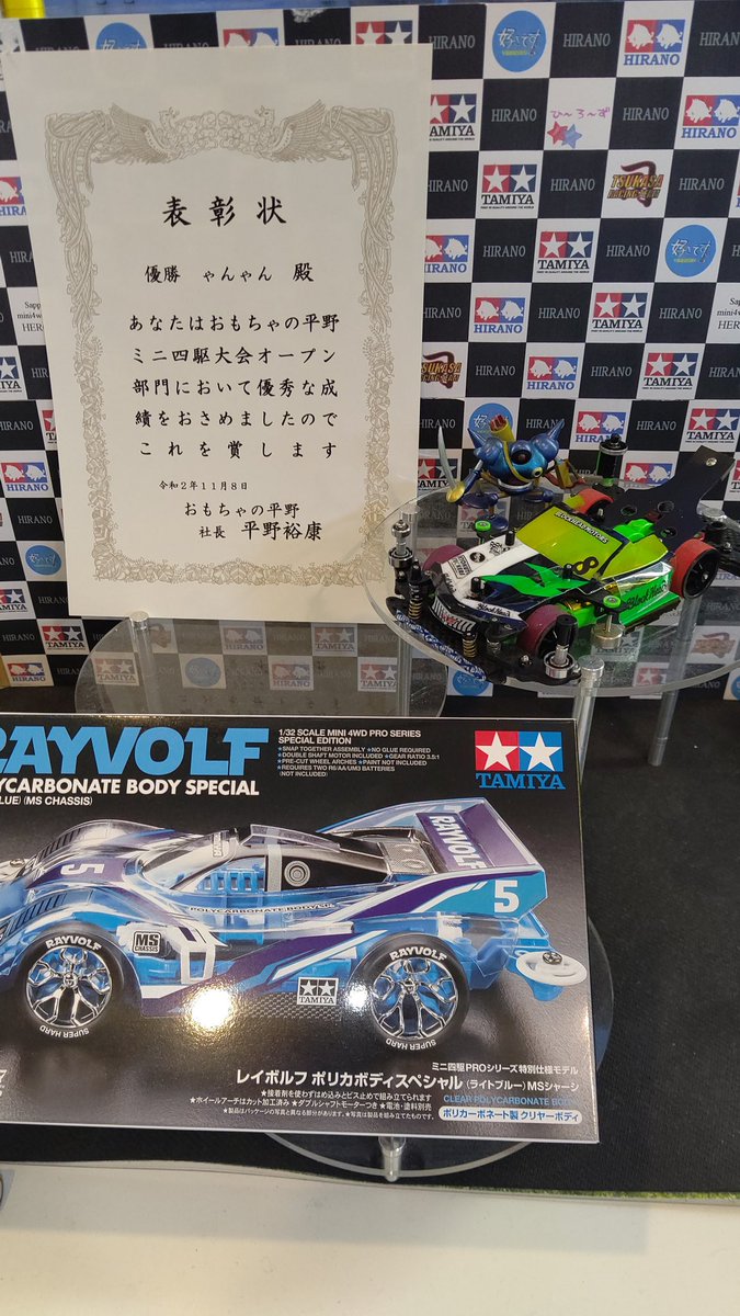 おもちゃの平野ミニ四駆大会、オープン部門優勝は、ゃんゃんです!高レベルの予選を勝ち抜き、決勝で更に一段速く走り優勝です!... [おもちゃの平野【Twitter】] | おもちゃの平野