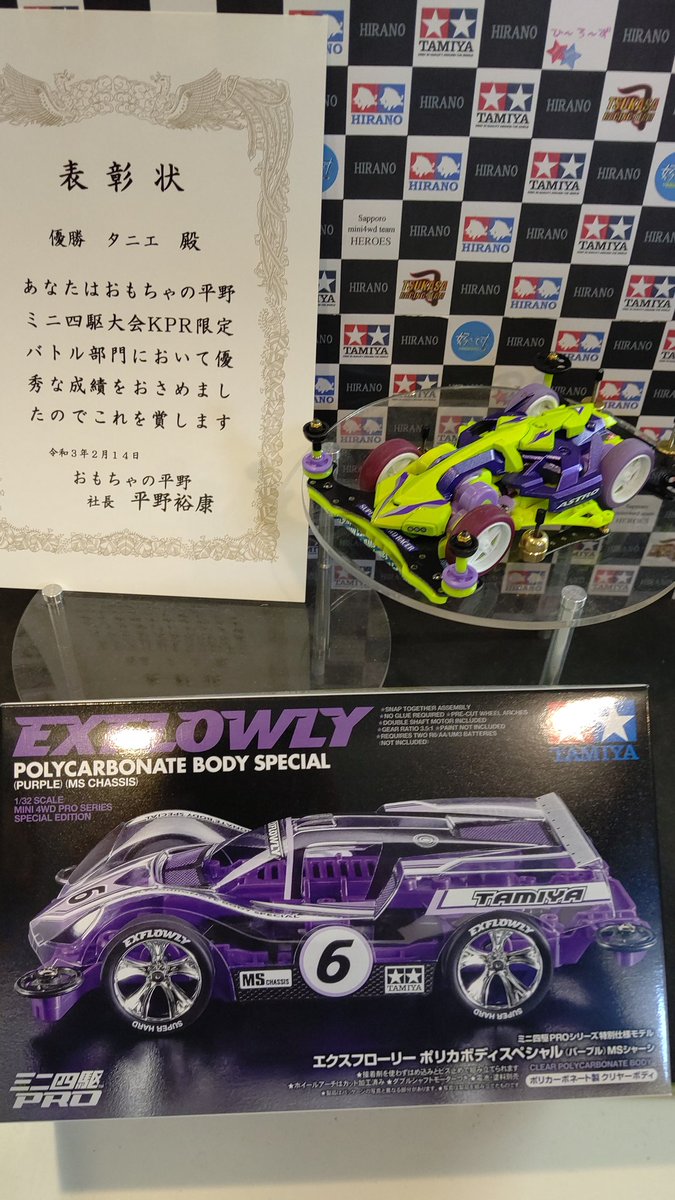 おもちゃの平野ミニ四駆大会、KPR部門優勝は、タニエさんです!予選も高速走行で順調にこなして、決勝戦は、ラスト一周で追いつき... [おもちゃの平野【Twitter】] | おもちゃの平野