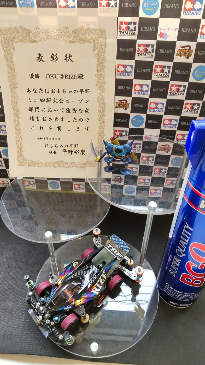 おもちゃの平野ミニ四駆大会、オープン部門優勝は、OKU君です!予選、全勝満点!他のマシンを圧倒的速さで勝ち抜き、完全優勝です!... [おもちゃの平野【Twitter】] | おもちゃの平野