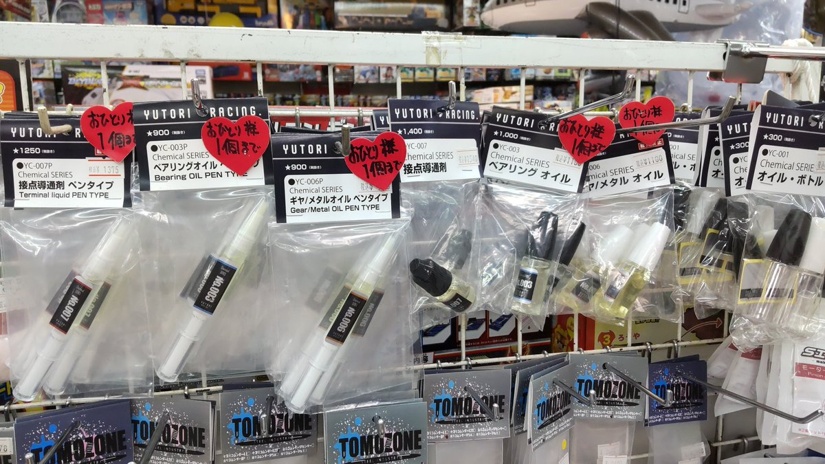 おもちゃの平野には、ミニ四駆の高性能オイルで有名なユトリオイルさんのベアリングオイル、ギアオイル、接点導通剤、オプショ... [おもちゃの平野【Twitter】]