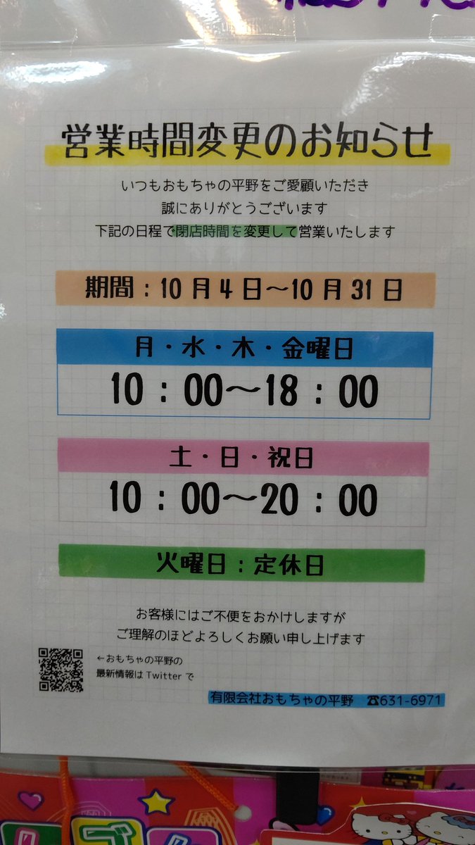 【営業時間変更のお知らせ】社長の腰の回復にはまだ時間がかかりそうなので、以下のように営業時間を変更します。火曜日を除く平日... [おもちゃの平野【Twitter】] | おもちゃの平野