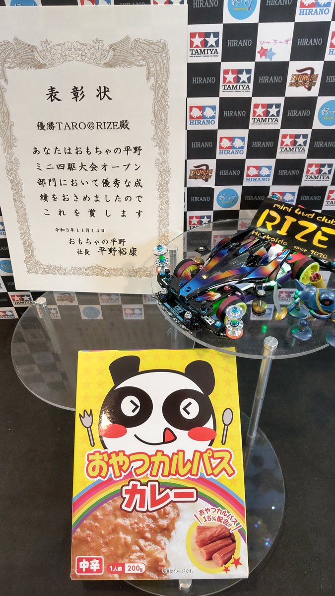 おもちゃの平野ミニ四駆大会オープン部門優勝は、TARO君です!予選も高得点で勝ち抜き、決勝戦の激戦を制しての優勝です!おめ... [おもちゃの平野【Twitter】] | おもちゃの平野