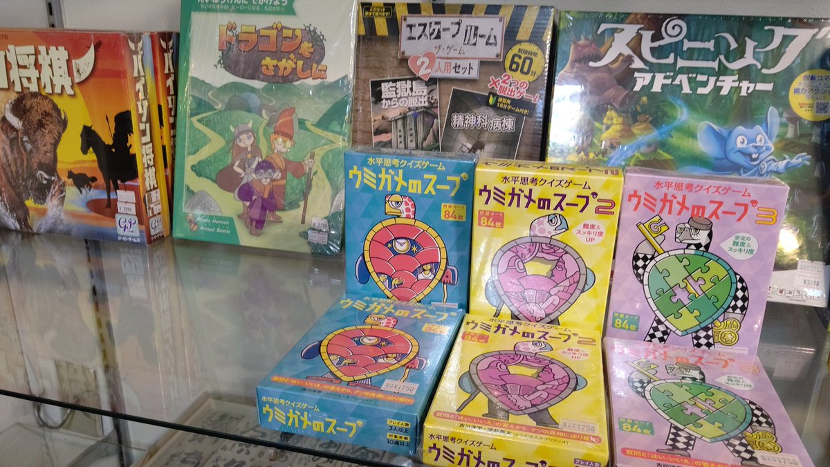 どうやらお客様に謎解きが好きな方がいるらしい・・・ それならば!とウミガメのスープを一緒に並べてみました✌️#アナログゲーム #ボ... [おもちゃの平野【Twitter】] | おもちゃの平野