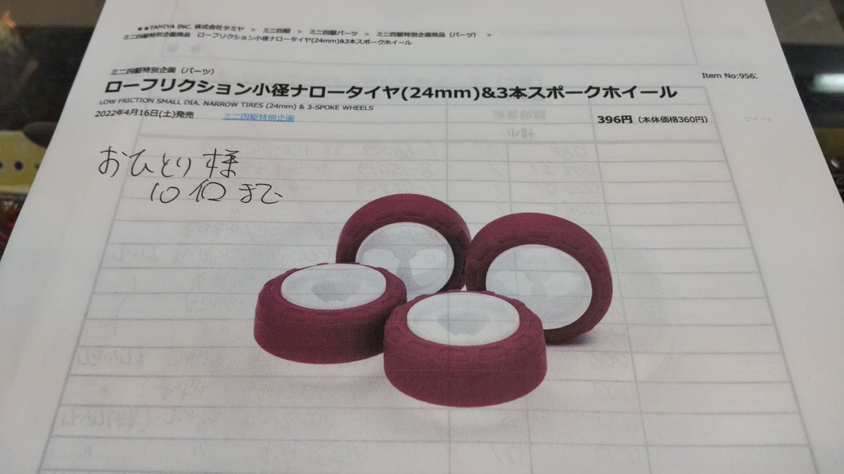おもちゃの平野ではミニ四駆限定パーツローフリクション小径タイヤの予約を店頭で受けてます。一人10個まで予約ができます。予... [おもちゃの平野【Twitter】]