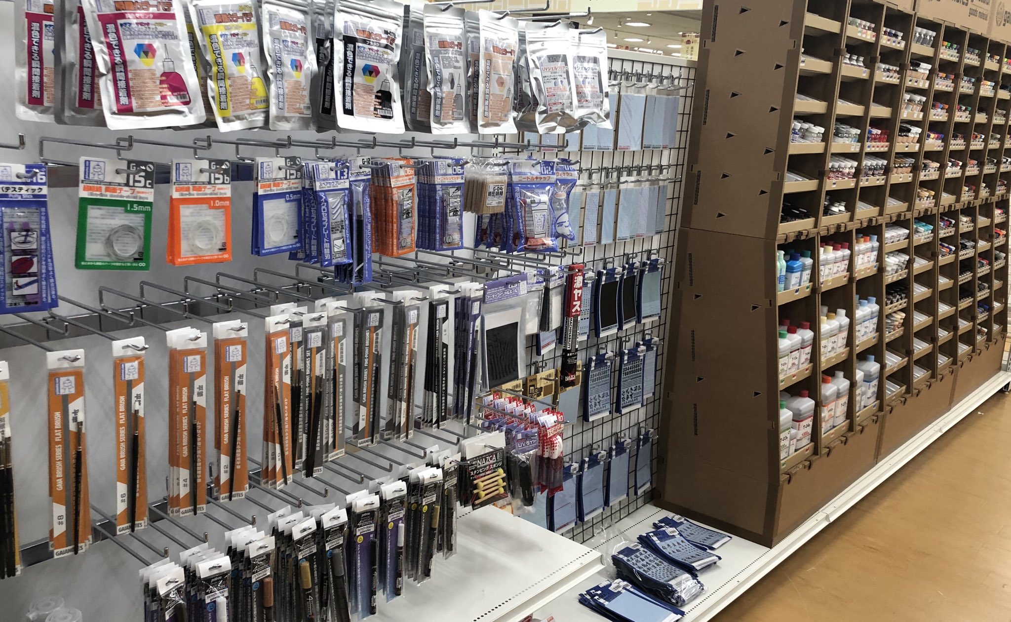 北海道でのお仕事終わって、これから帰ります。ガイアノーツ全製品が並ぶ売り場の設営してきました。 模型工具の売り場としては日本でも1番大きいのでは...という充実ぶりです。 何処のお店かは...まだ秘密(>_<) pic.twitter.com/UQ9l9c19CN