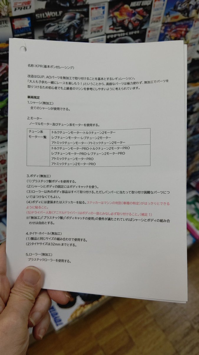 KPRのレギュレーションの紙を売場に置いておくのでご自由にお持ちくださいませ〜#ミニ四駆 #KPR #おもちゃの平野 [おもちゃの平野【Twitter】] | おもちゃの平野