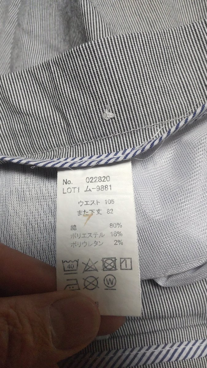 4月まで着ていたスラックス、サイズを改めて見てみた、大きいね(笑) [おもちゃの平野【Twitter】]