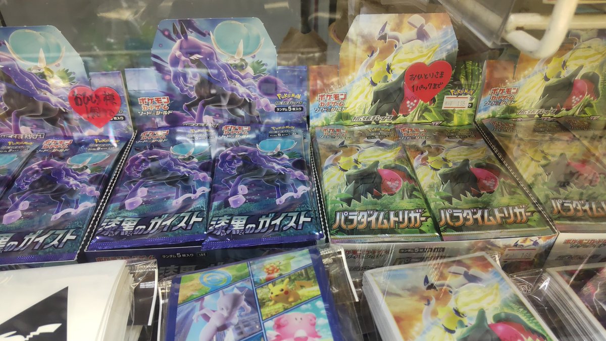 おもちゃの平野では、ポケモンカードのパック販売しています。現在(11月9日)は、漆黒のガイスト、パラダイムトリガー、をお一人... [おもちゃの平野【Twitter】]