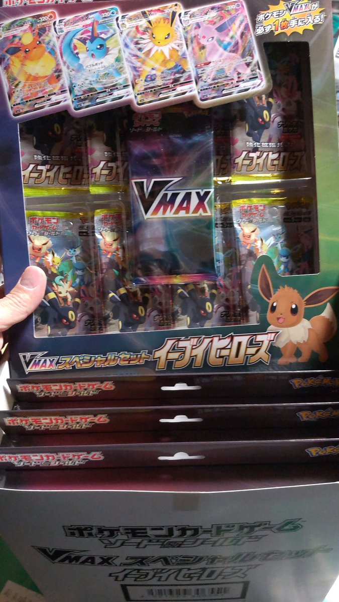 勢いまかせに、色々店頭販売してます。スペイン戦で勝利したら、これを販売しよう!イーブイヒーローズVMAXスペシャルセット!... [おもちゃの平野【Twitter】] | おもちゃの平野