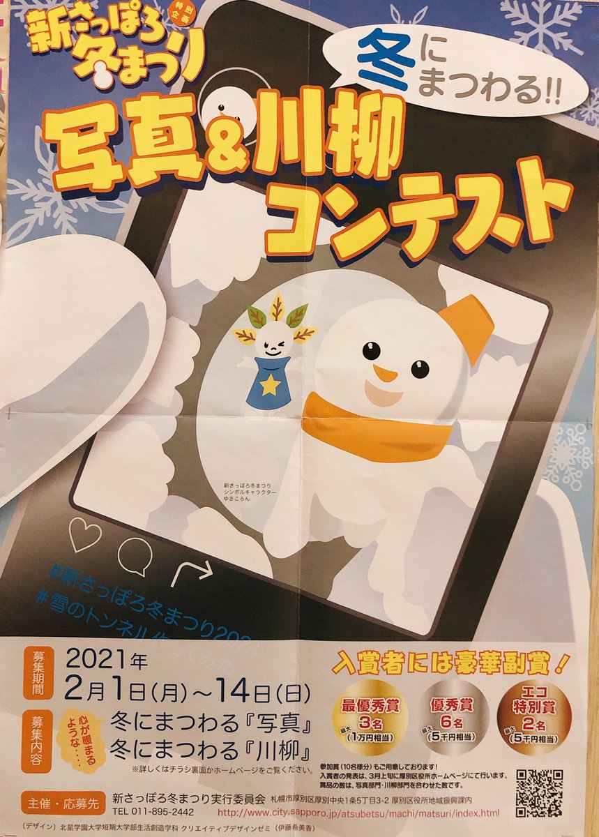 今年は「新さっぽろ冬まつり」がコロナの影響で開催中止となります。そこで厚別区では特別企画として「写真&川柳コンテスト」を... [カラオケピロス【Twitter】]