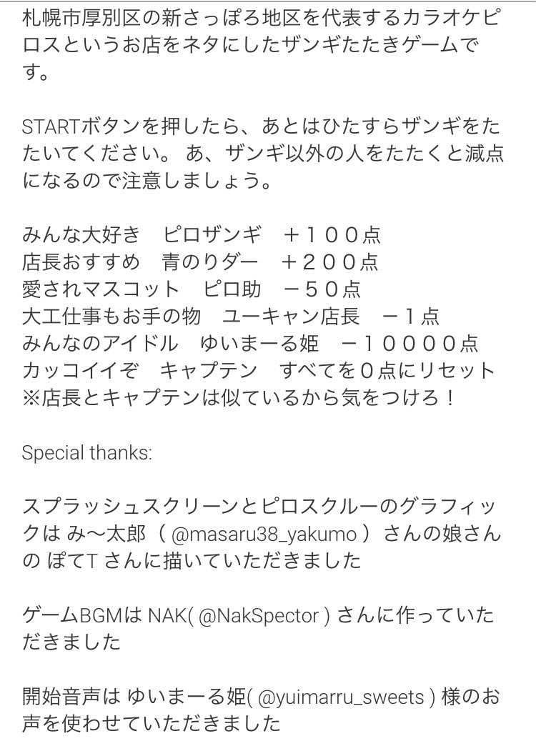 UMEDAさんがピロスをネタにした《#ザンギたたき》なるゲームを制作してくださり無料で提供中です!/https://t.co/kcRHN5b... [カラオケピロス【Twitter】]