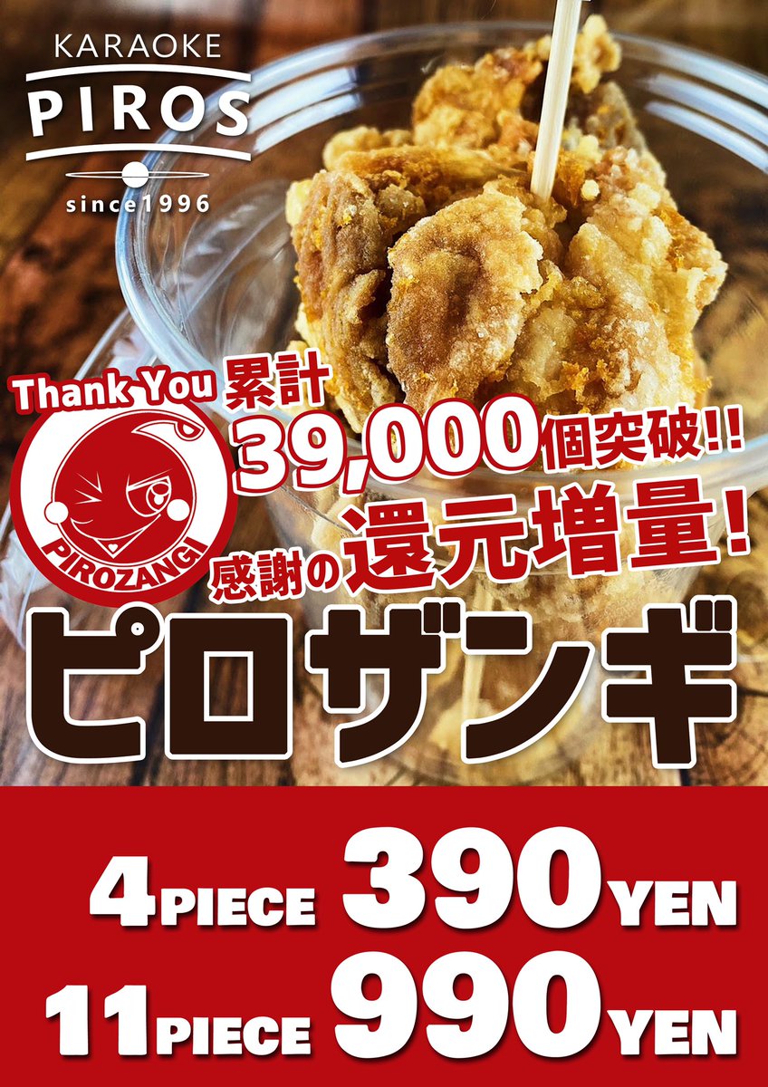 /#拡散希望ピロザンギカー🚚累計39000個突破‼️感謝の還元増量🍗🍗🍗✨\ピロザンギが390円🍗8/24(火)よりカラオケピロス... [カラオケピロス【Twitter】]