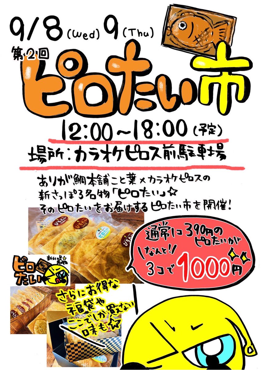 /帰ってきた!第二回ピロたい市🌟\前回大好評だったピロたい市を開催します!日時:9/8.9の二日間 12時〜18時まで場... [カラオケピロス【Twitter】] | カラオケピロス