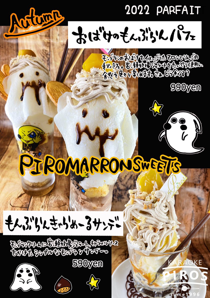 \本日より発売⭐️/ピロマロンスイーツたち🌰✨秋といえばマロン!モンブランスイーツが2種類登場‼️●おばけのもんぶらんパフェ👻🌰... [カラオケピロス【Twitter】]