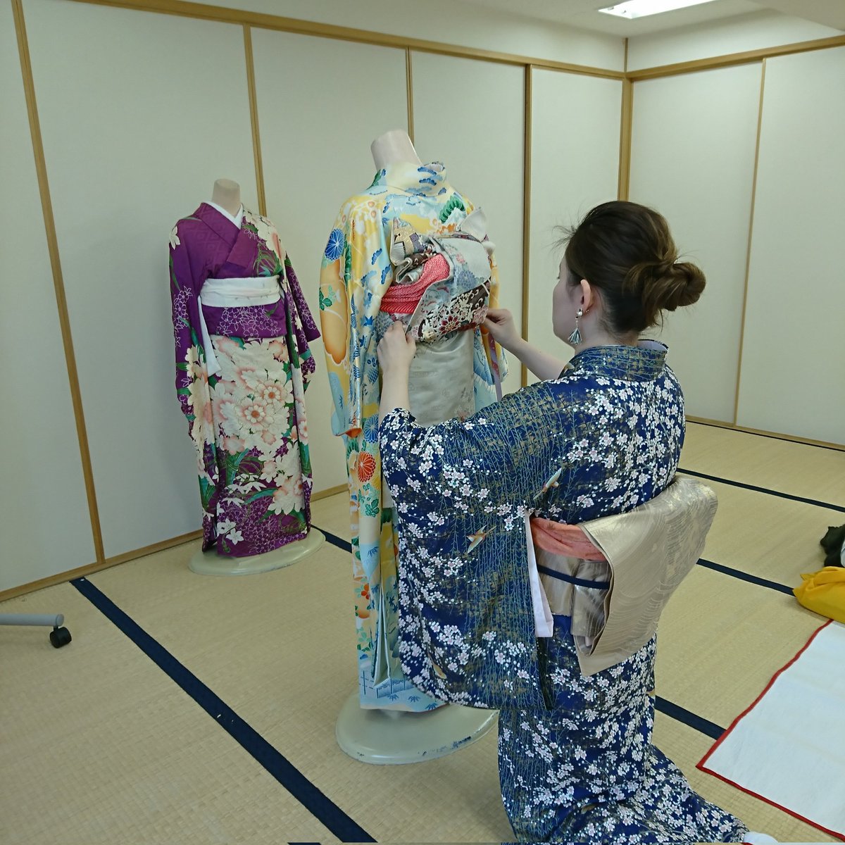 本日は帯広校で衣紋会開催💐壷装束の着装研修です👘壷折•幅の調整•こみの技法や懸帯•懸守など現代のきもの着つけには見られない色々をし... [小林豊子きもの学院【Twitter】]