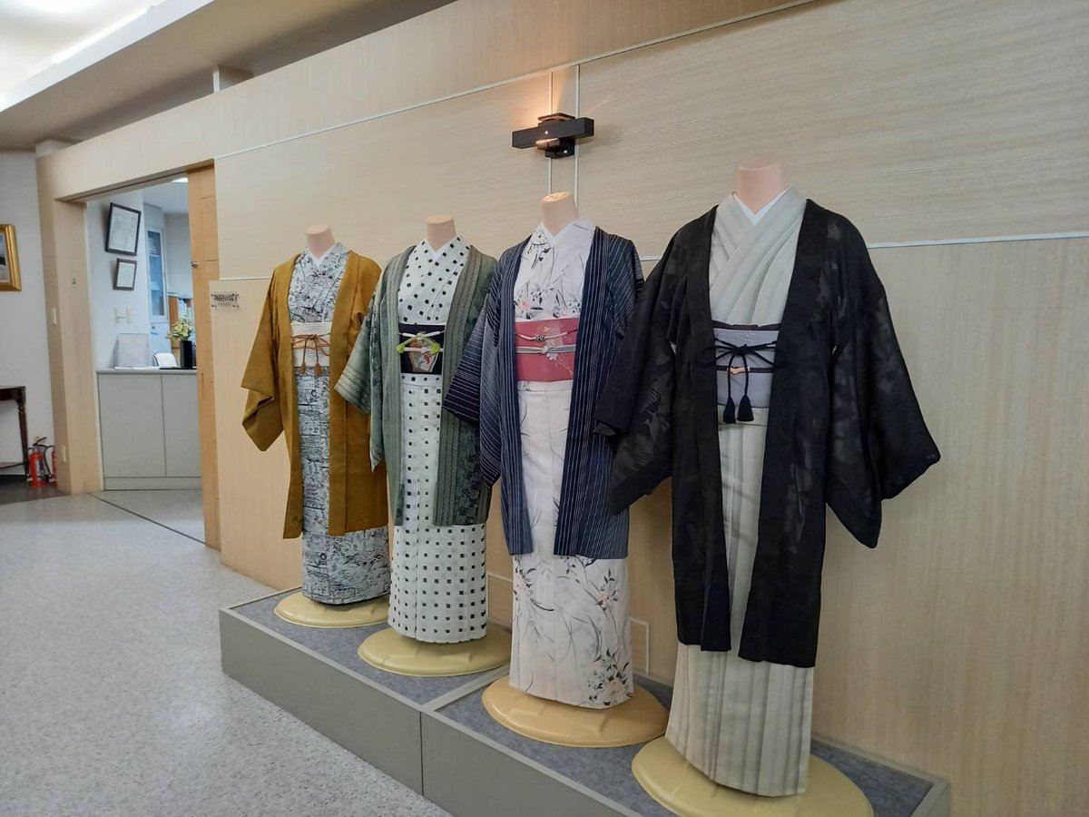 函館校で羽織コーディネートを特別展示しています💐袷、単衣、夏ものと、季節や気温に合わせて着回すアウター👍そしておしゃれなファッションアイテム✨お楽しみください😊