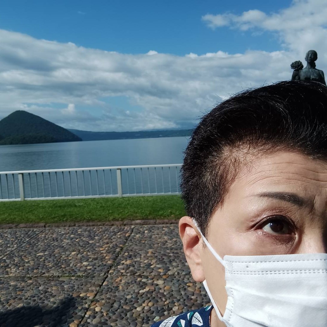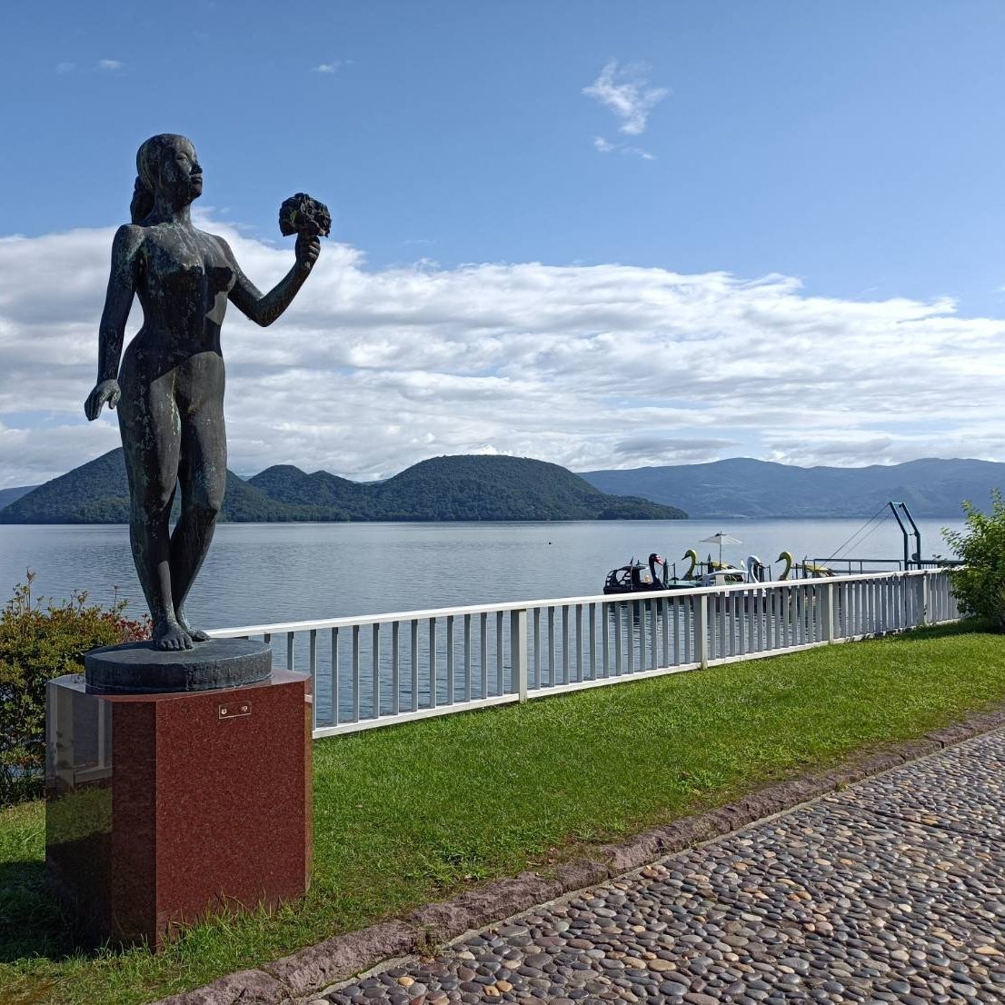 【講師の休日④】社員旅行2日目快晴の洞爺湖を散策中☀️湖畔には58基の彫刻が設置されているそうです✨読書好きの伊藤札幌学院長はホテ... [小林豊子きもの学院【Twitter】] | 小林豊子きもの学院