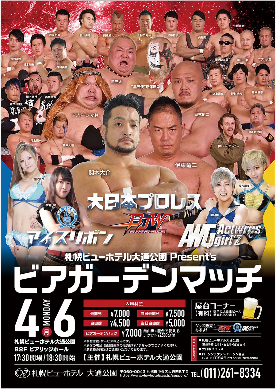 大日本プロレスとアイスリボンなど、人気選手による正統派からお笑い系まで白熱の試合を観戦しながら、ビアガーデンが楽しめます。