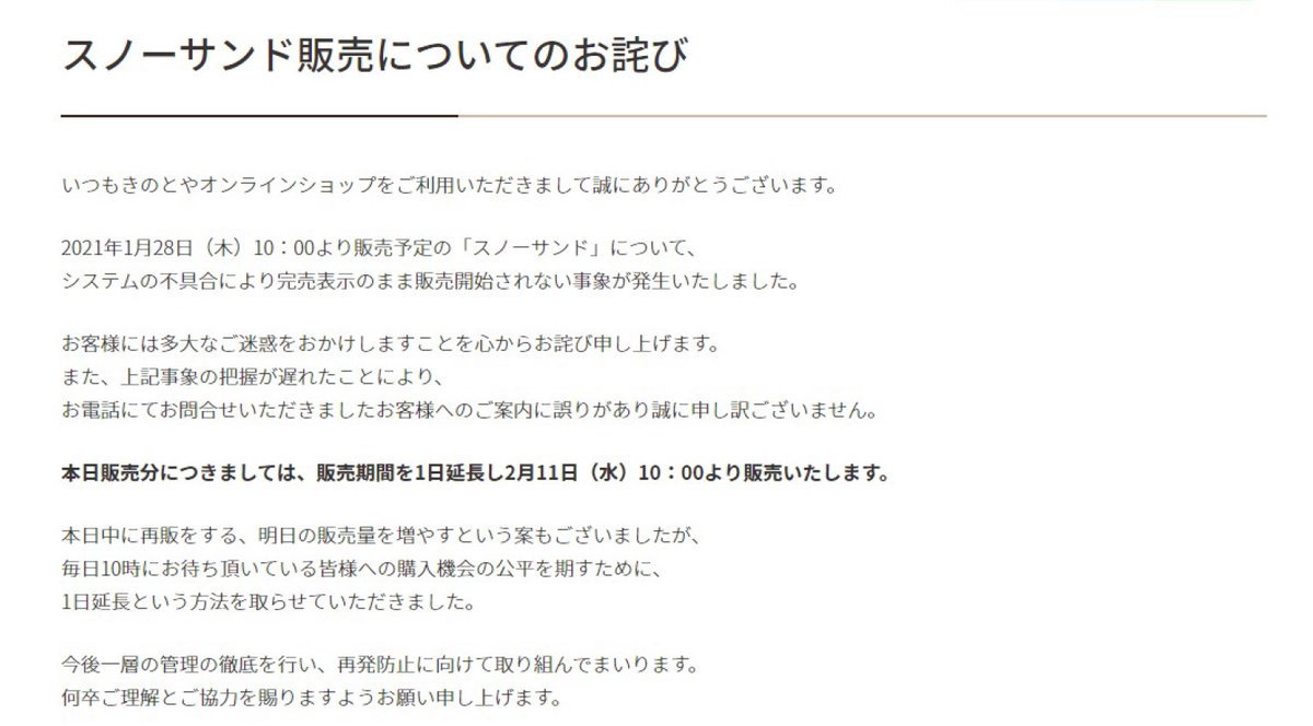 【スノーサンド販売についてのお詫び】いつもご利用いただきまして誠にありがとうございます。2021年1月28日(木)10:00より販売... [洋菓子きのとや【Twitter】]
