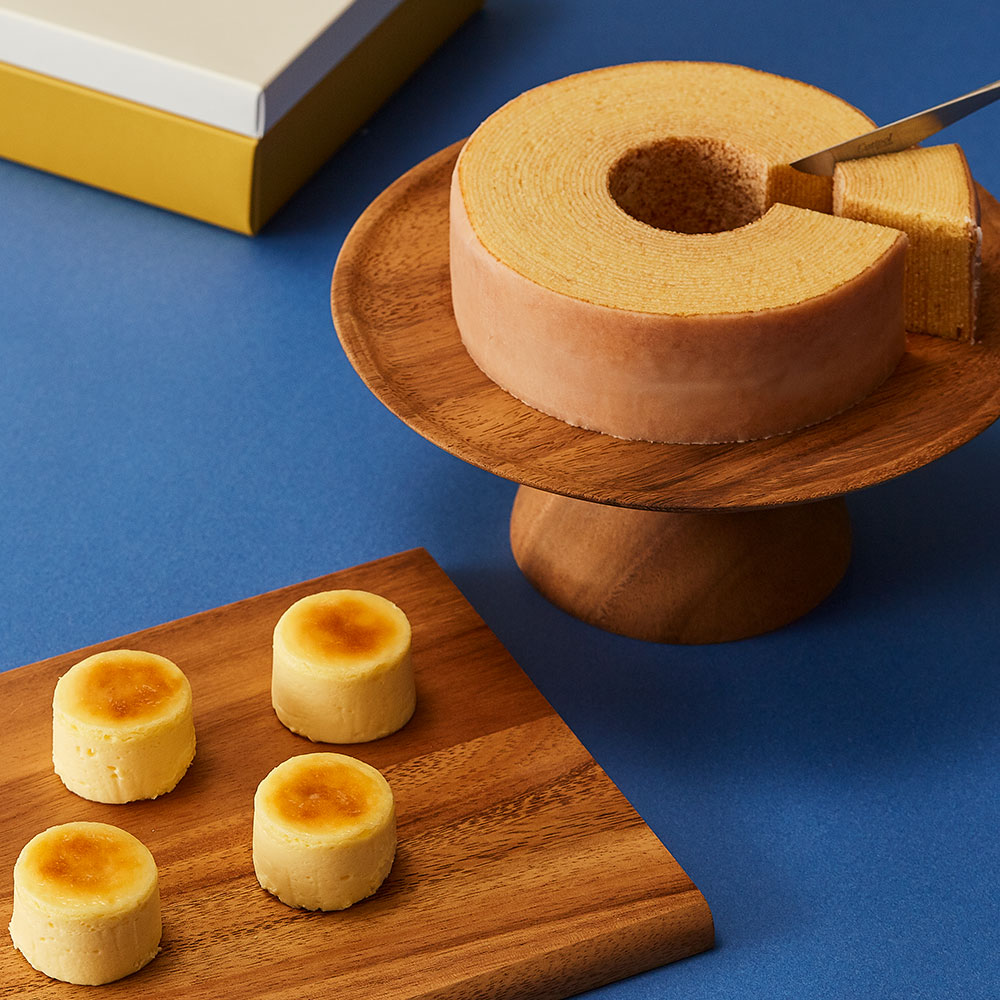 北海道産素材にこだわり、丁寧に焼き上げた「きのとやバームクーヘン」と、北海道産クリームチーズを使用した自慢の「チーズスフレ」のセット。