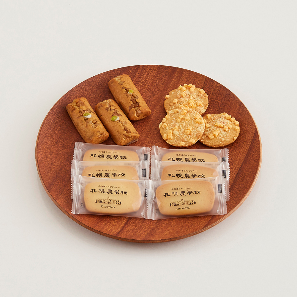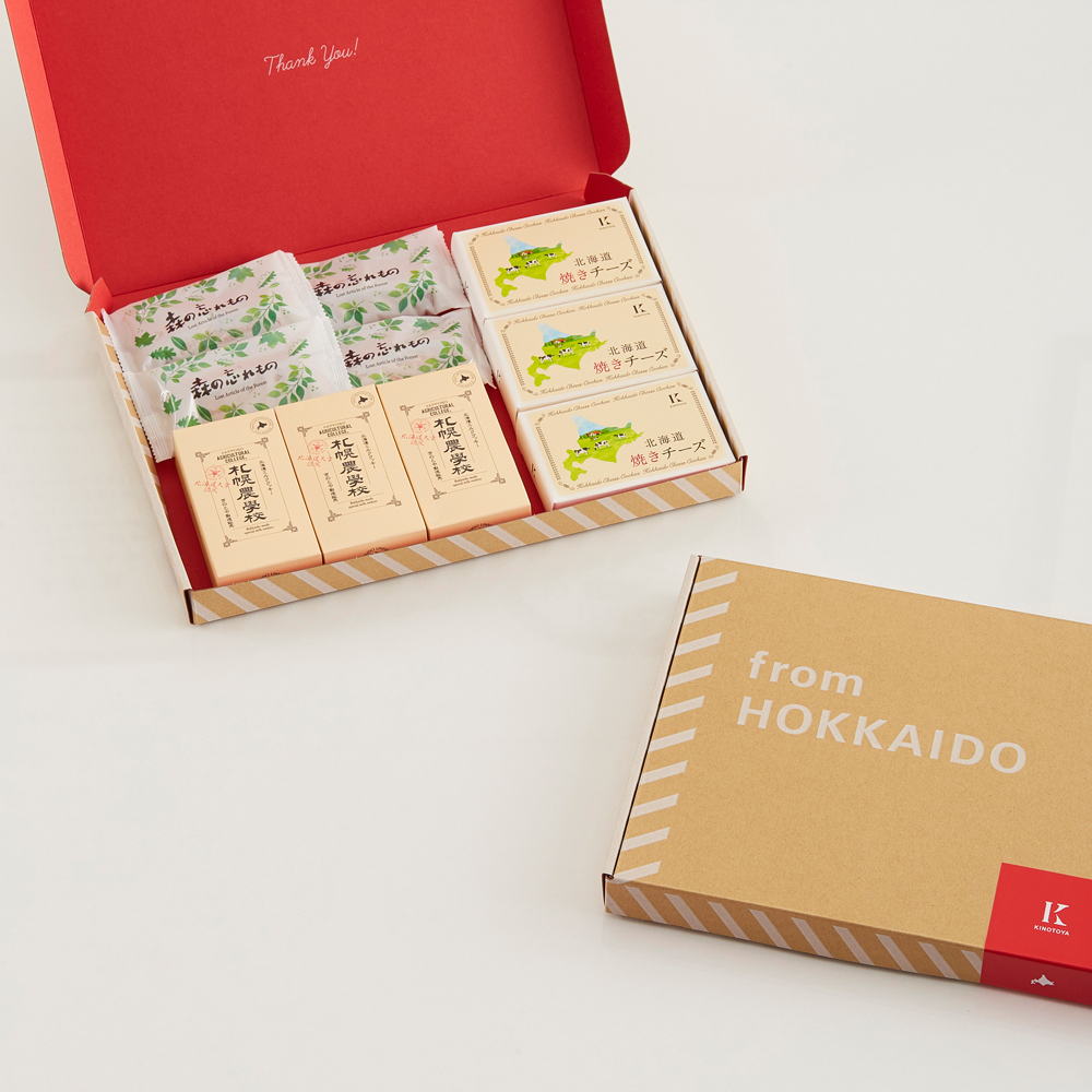 定番人気の「北海道ミルククッキー札幌農学校」や、チーズの美味しさを活かしたクッキー「北海道焼きチーズ」、小豆のこし餡をブレンドし、しっとりと焼き上げた「森の忘れもの」を詰め合わせました。